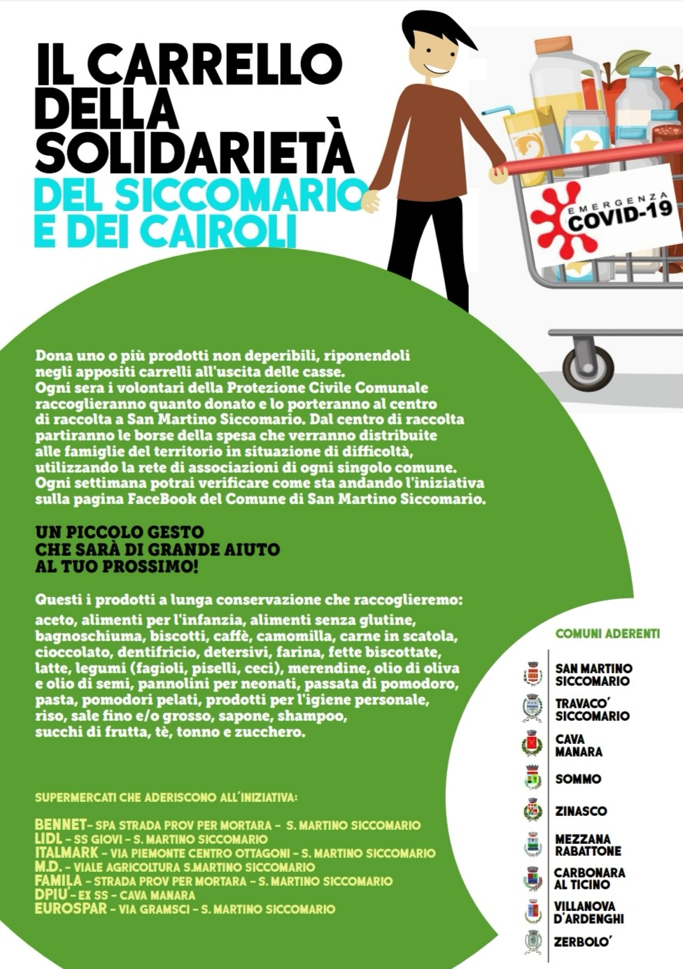 Da lunedì 27 aprile, si avvierà la fase operativa de "IL CARRELLO DELLA SOLIDARIETA' del Siccomario e dei Cairoli", che vedrà coinvolti nove Comuni, sette supermercati e più di settanta volontari dei gruppi comunali e delle associazioni di protezione civile del territorio. Il progetto parte dall'esperienza delle raccolte alimentari periodiche, trasformandola in una raccolta permanente e sistemica su tutti i centri commerciali del territorio che hanno prontamente aderito. Verranno posizionati dei carrelli all'uscita delle casse dei supermercati, ben evidenziati da apposita cartellonistica, nei quali i cittadini potranno donare uno o più prodotti non deperibili.