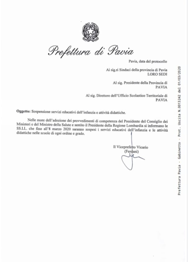In attesa del testo definitivo del decreto governativo, anticipiamo la circolare che comunica la sospensione delle attività didattiche nelle scuole di ogni ordine e grado per la prossima settimana.