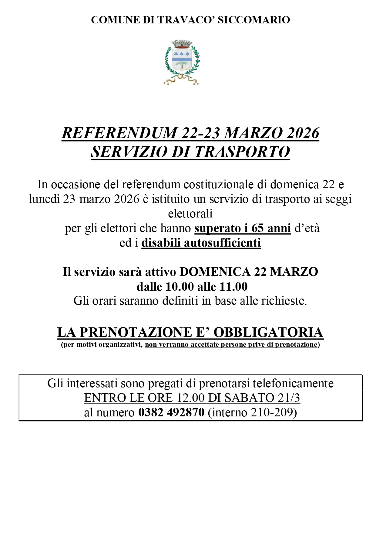 In occasione del referendum costituzionale del 22-23 marzo è stato istituito un servizio di trasporto ai seggi, su prenotazione, per gli elettori over 65 ed i disabili autosufficienti. Il servizio sarà attivo, su prenotazione, domenica 22 marzo dalle 10 alle 11. Per modalità di accesso si rimanda al volantino allegato