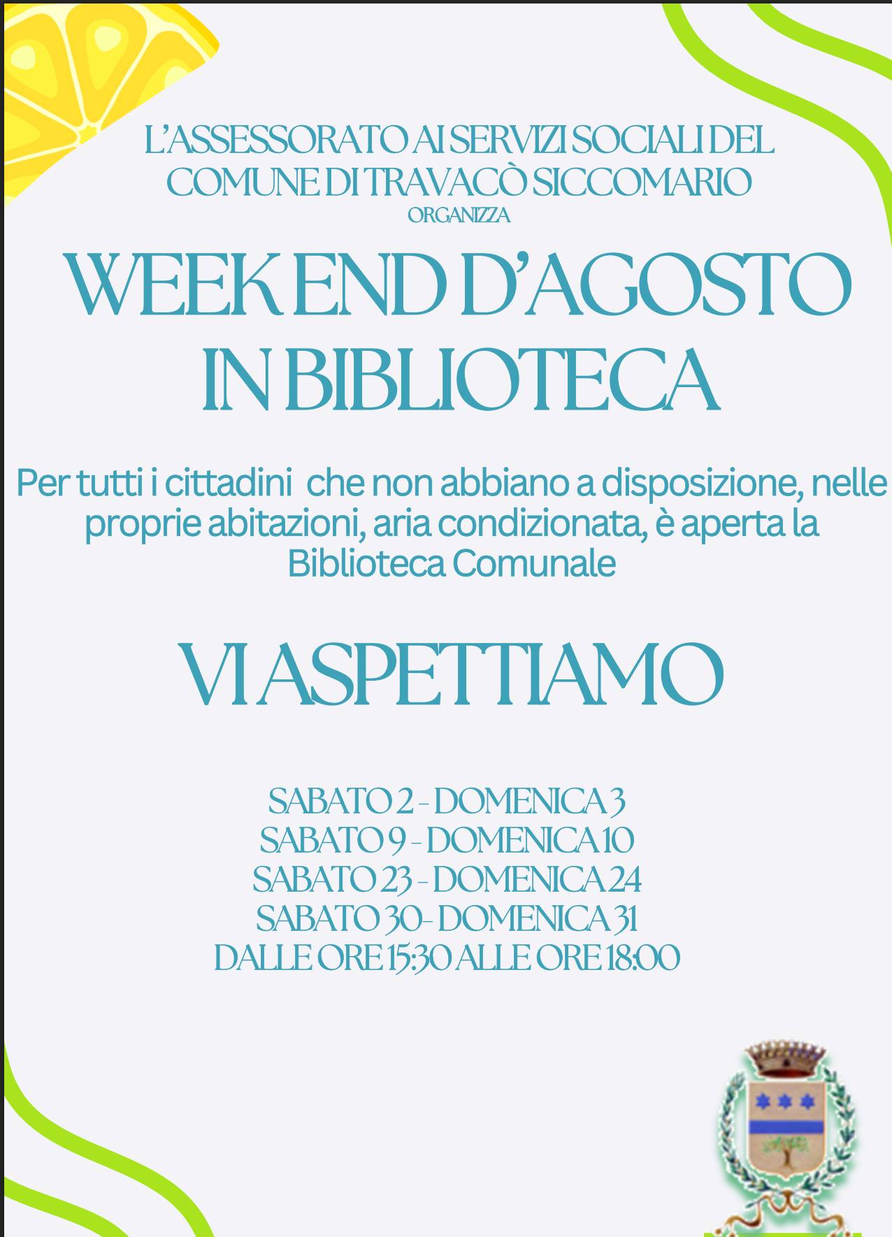 Per tutti i cittadini che non abbiano a disposizione, nelle proprie abitazioni, aria condizionata, è aperta la Biblioteca Comunale